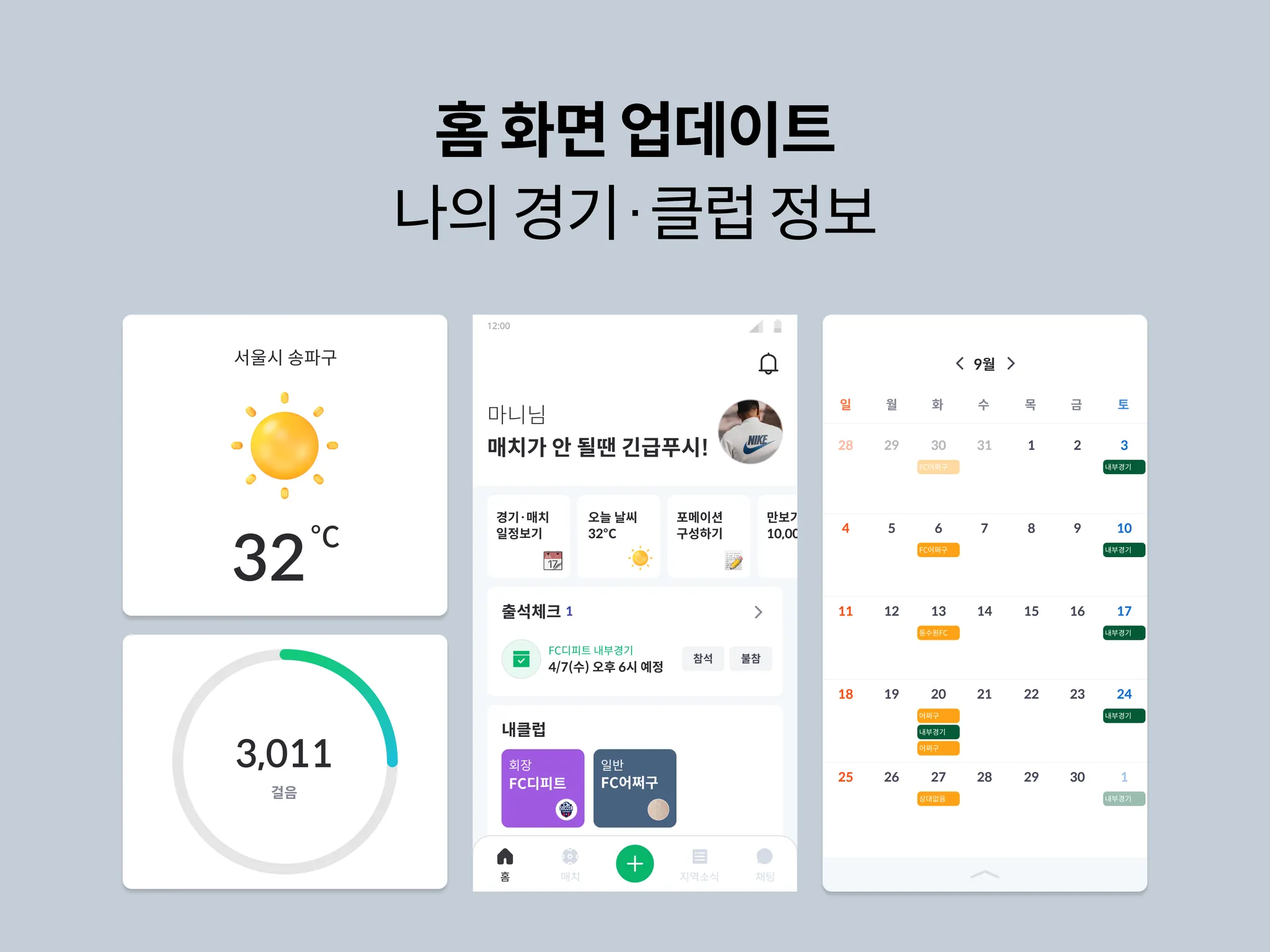 사용자 편의 기능 및 특히 축구/ 풋살 종목에 특화된 기능들을 편하게 사용할 수 있도록 구성