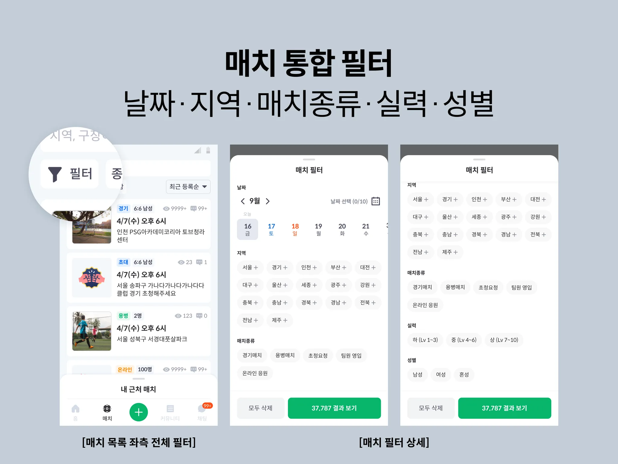 매치 통합 필터를 통해 [날짜 · 지역 · 매치종류 · 실력 · 성별]로 검색해보세요 ;)