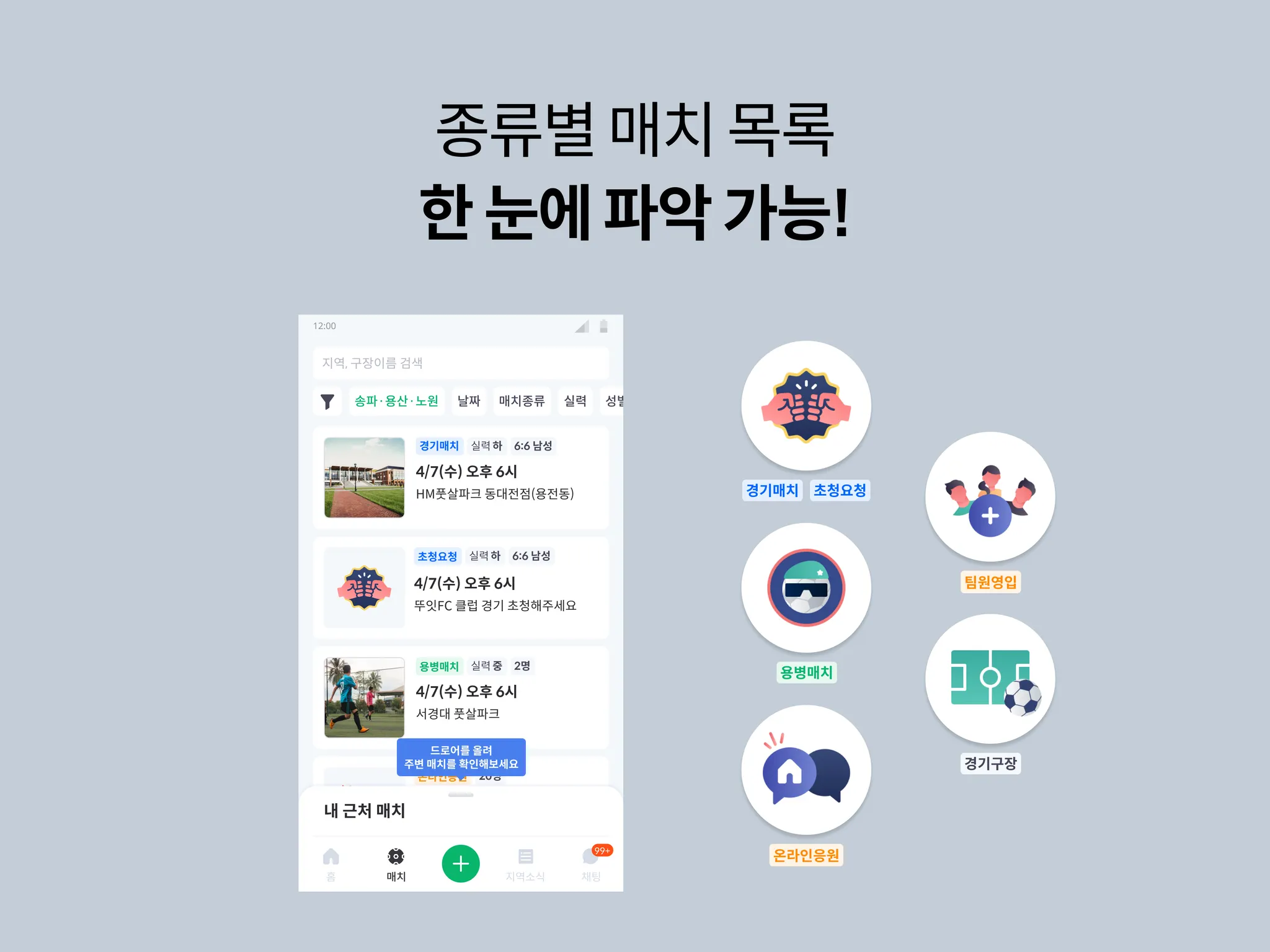 위치 기반으로 지도를 통해 가까운 경기와 매치 정보를 확인 가능