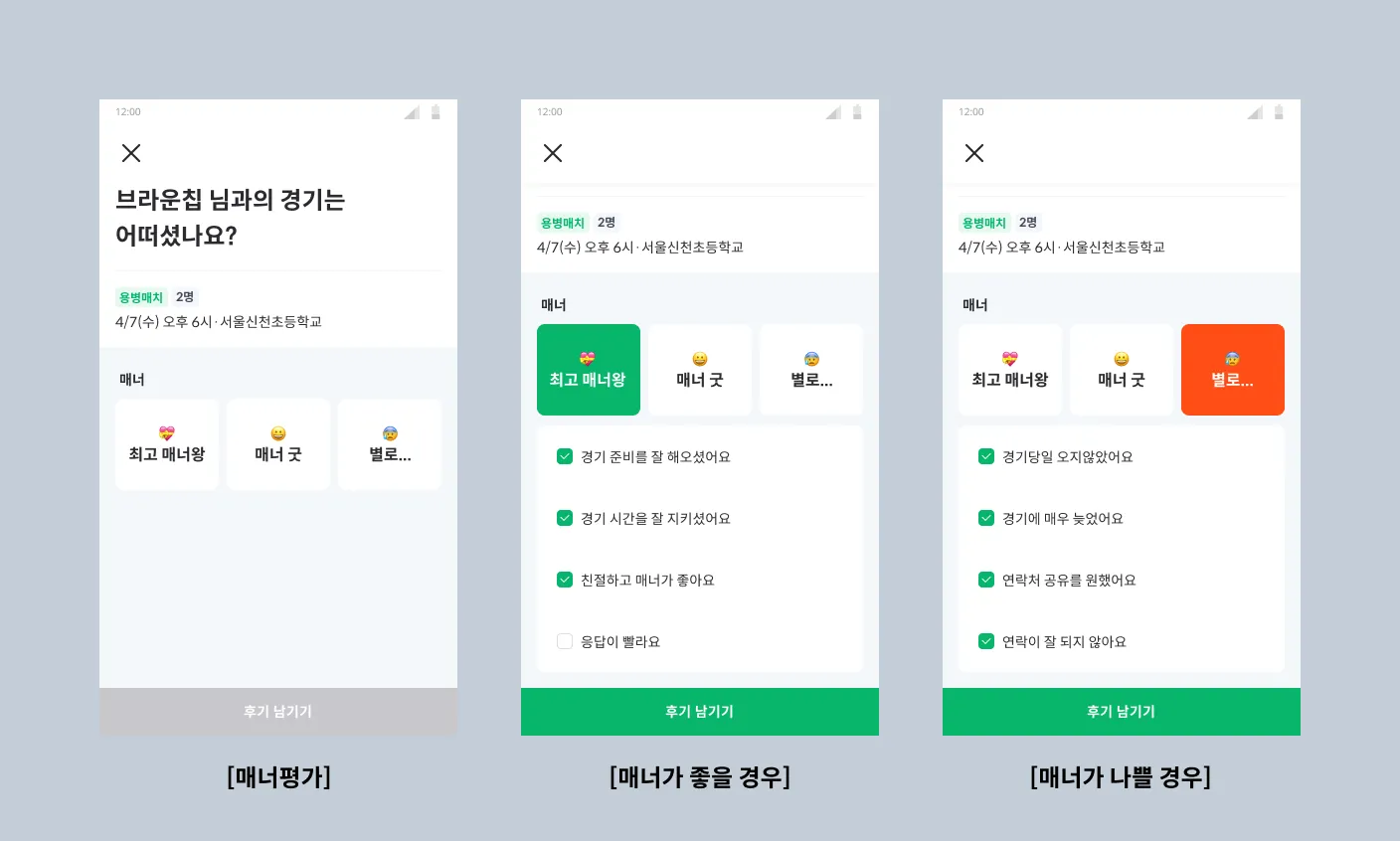 실력·매너 평가는 같이 채팅을 했거나 실제로 매칭을 한 사용자들이 서로 상호 평가를 통해 할 수 있어요. 경기 매칭 종료 후 ‘후기 남기기’를 통해 같이 경기했을 때의 상대방의 실력과 매너점수를 평가할 수 있어요.